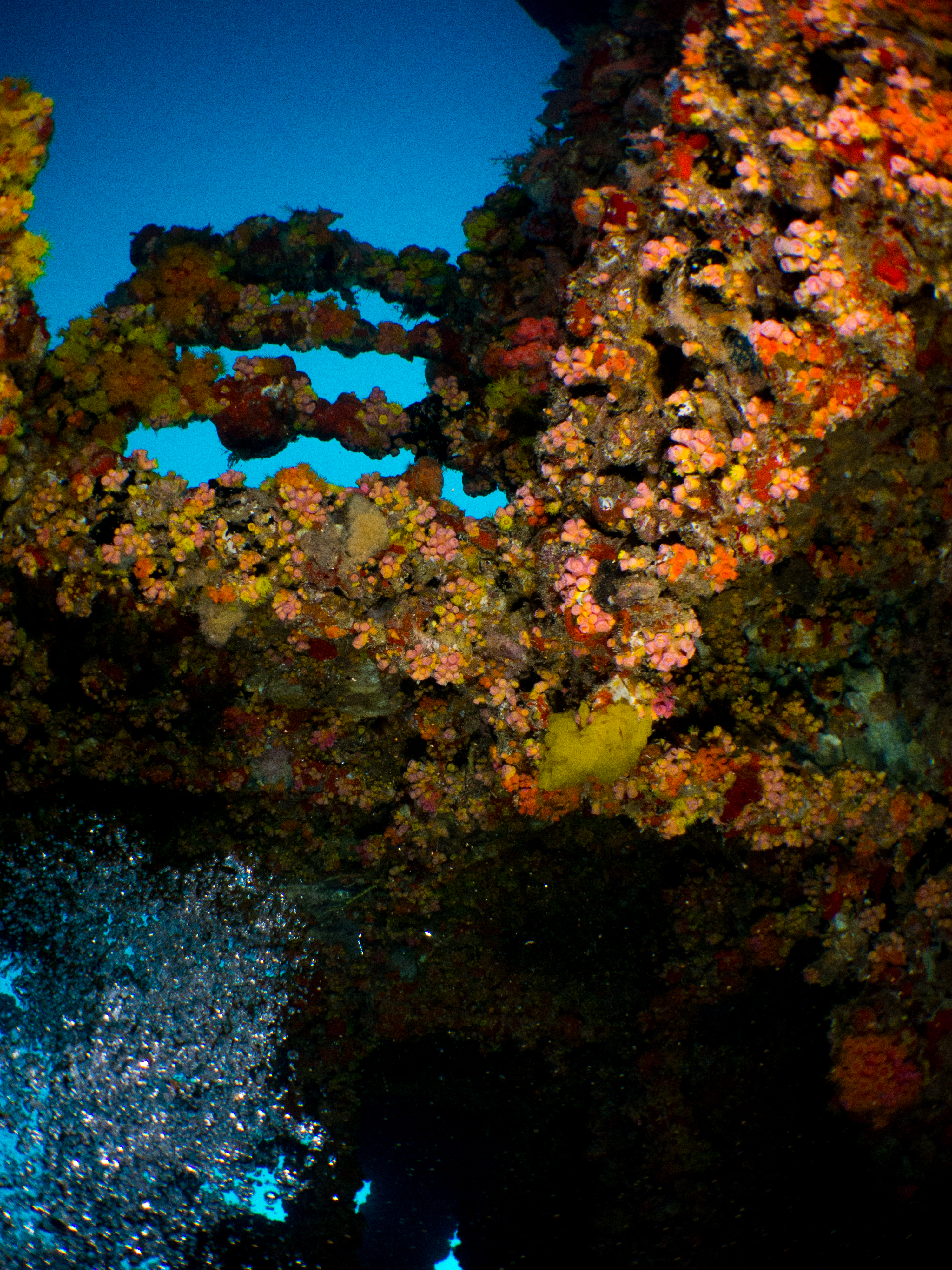Since the sinking of the UC, the ocean has decorated the ship with its own masterpiece of color and texture.  Psychedelic doesn’t begin to describe the intricacies of each and every wall of this wreck – this image shows a 10′ x 20′ area of the wheelhouse, with every single inch covered in life.  Strobe flashes bring out tonality that hides in the dark and captivates the viewer.  Every time I dive the UC, I seem to spend more time than anticipated just staring at these ornate walls.