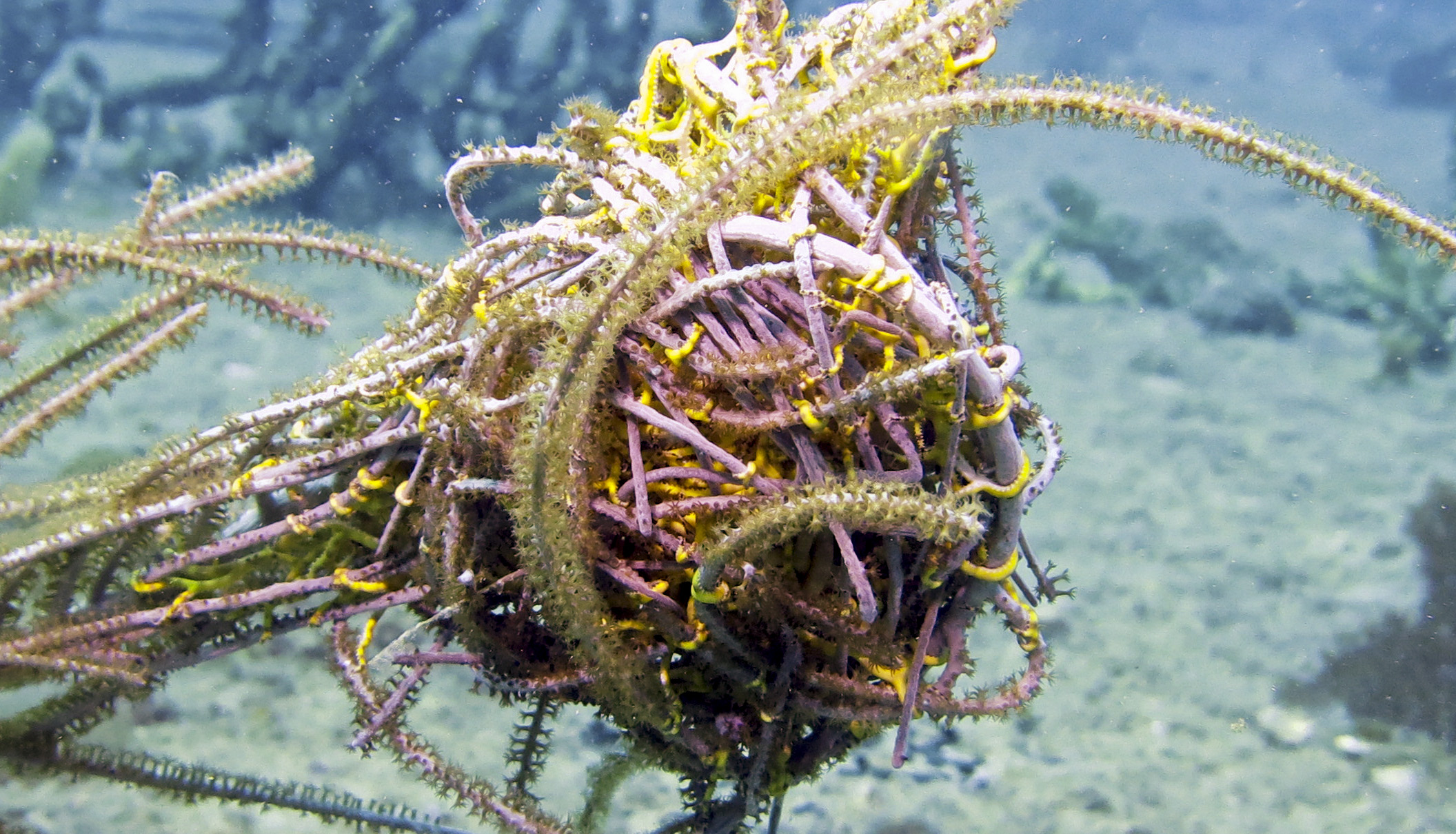 Giant Basket Star (Astrophyton muricatum) wraps itself in a Slimy Sea Plume (Pseudopterogorgia americana) for protection during the daytime – United Caribbean, Deerfield Beach, Fl