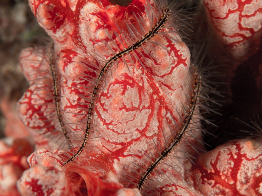 Sponge Brittle Star (Ophiothrix suensoni) wrapping itself around a Pink & Red Encrusting Sponge (Spirastrella coccinea) – Shallow Patch Reef, Boca Raton, Fl