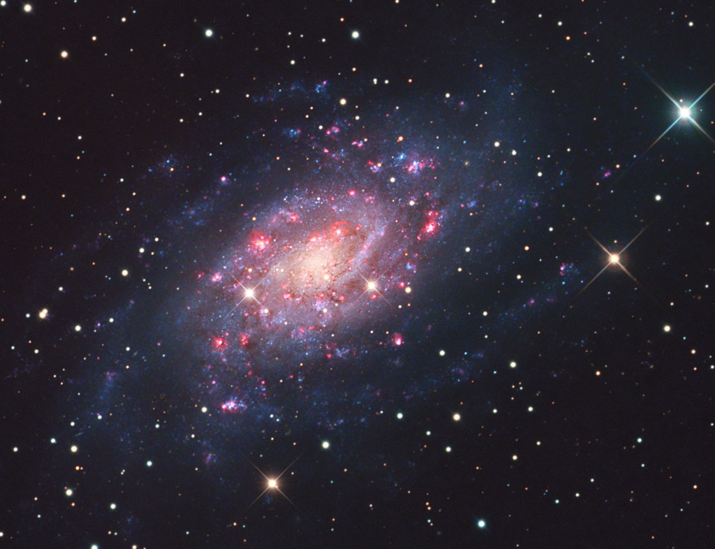 Above is an image LR(Ha)GB of a galaxy 10 million light years away with great star formation nebulae!  It is composed of 6 hrs. of luminance, 7 hrs. total of RGB (binned) and 10 hrs. of unbinned H-alpha data.  Below that is an image just showing the 10 hour hydrogen-alpha giant star forming regions.