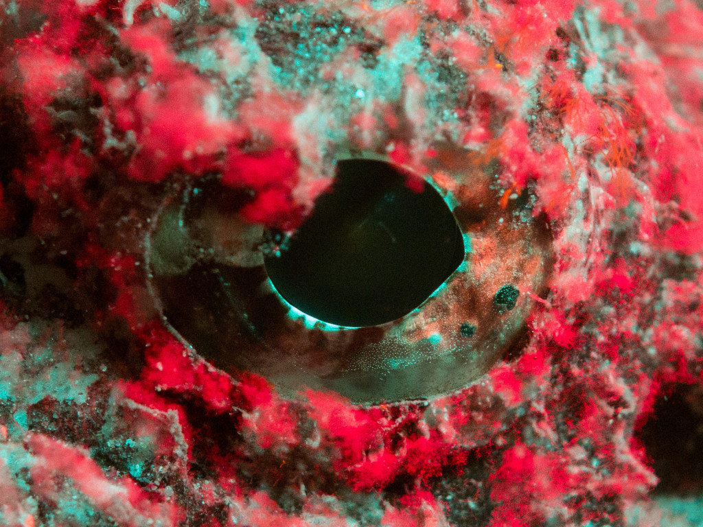 Scorpionfish use camouflage as their primary means of predation. They cultivate a garden of algae on their face and body to blend in with their surroundings, often disappearing with a paint job perfectly matched with their hunting grounds. This algae, however, responds bright red when excited with our high-intensity fluoro lights. Unsure of how close I could really get to the animal and achieve a nice picture, I slipped in close enough where I could see myself in its eye, beyond its new, fiery hair color.