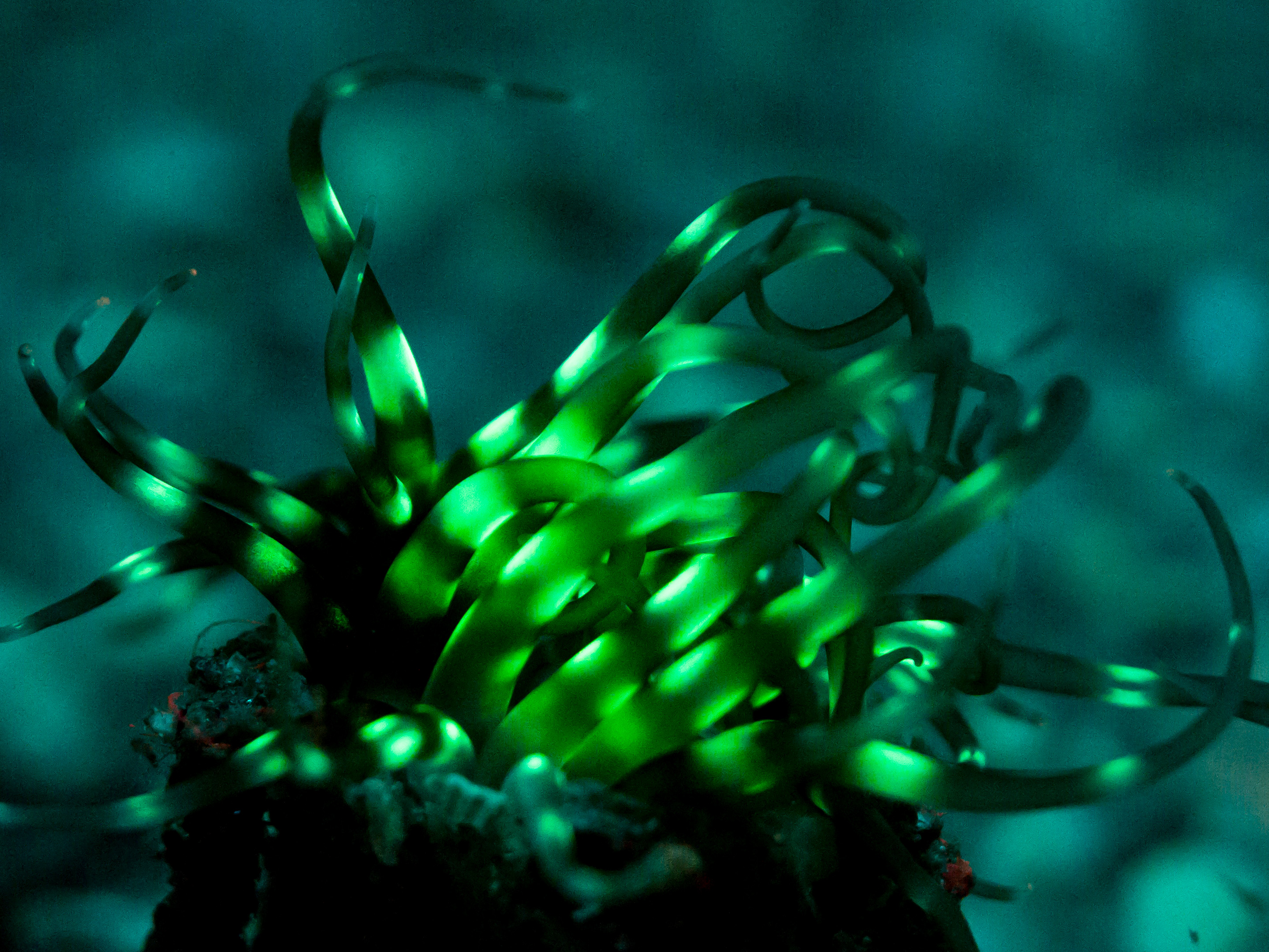 Tube Dwelling Anemones are beautiful.  They look like mini Bellagio fountains – exploding in every direction as they sway, grab, and tuck to grab passing food particles.  You would never know that they glow such an astounding neon-green before hitting it with a blue fluorescent light.  Tube dwellers are beautiful during the day, but have an unmatched beauty when you get to witness them glow brightly.