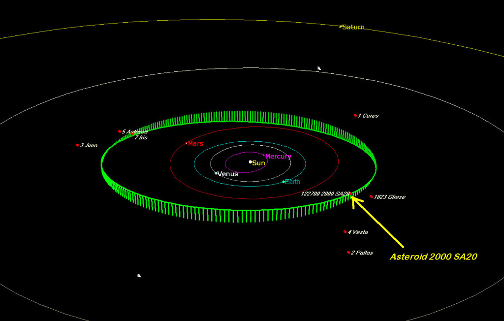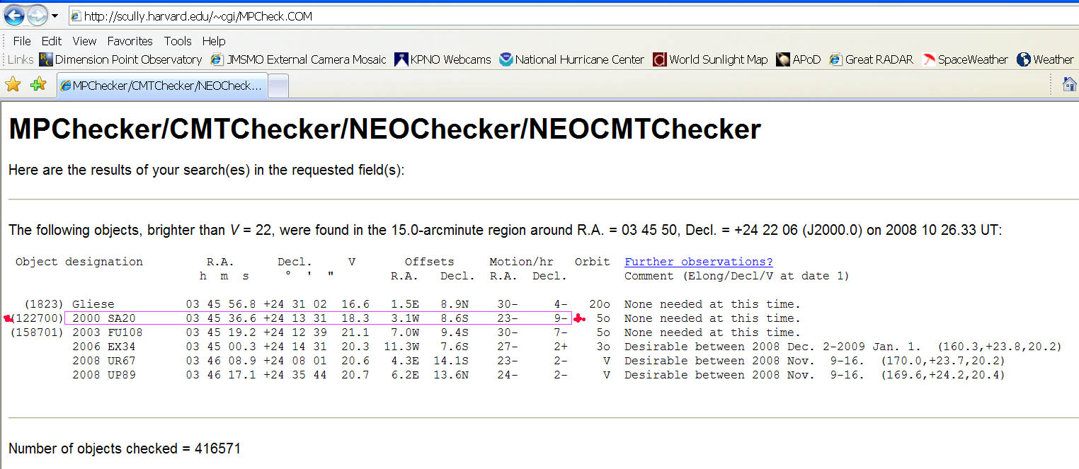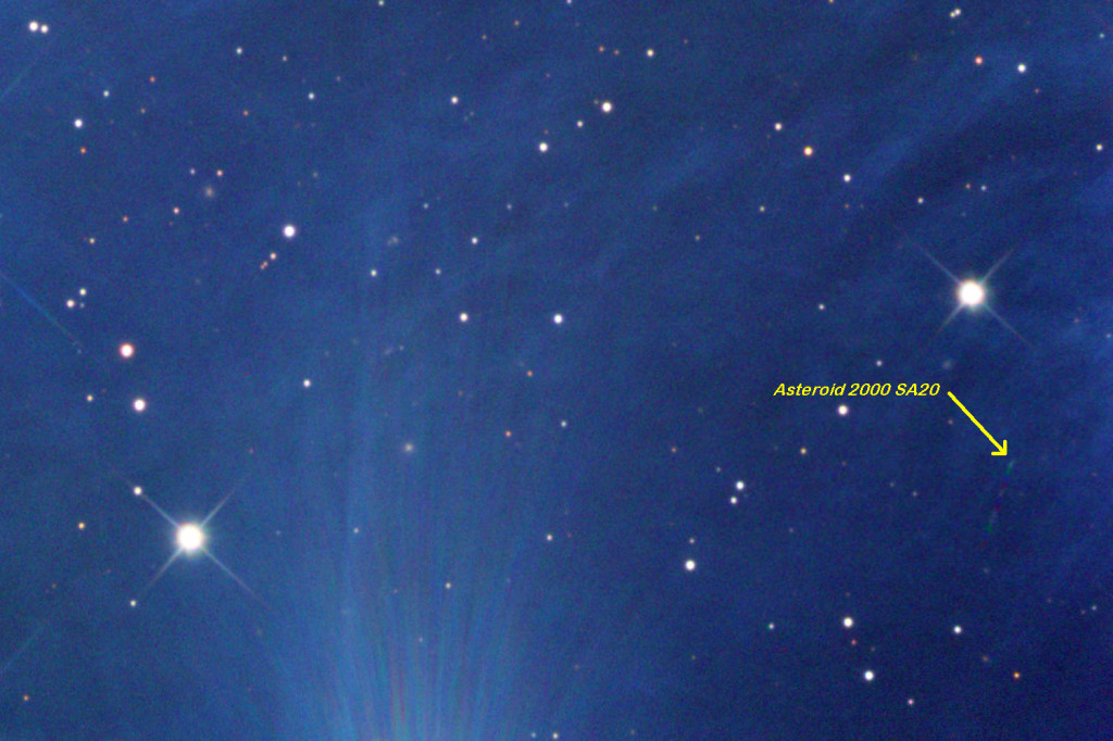 Like Bruce Pipes, I accidentally caught an asteroid on my data from the 2008 Chiefland Star Party. The asteroid can be seen shining through the Cirrus Nebula between Maia and Electra in M45! You can see the multi-colored dashed line since the exposure included LRGB frames. Using the Harvard Minor Planet Checker database, I identified this as mainbelt asteroid “122700 2000 SA20” at magn. 18.3. It was discovered by LINEAR (link attached) at Socorro, New Mexico on September 23, 2000. I linked my image to The Sky and added 2000 SA20 to the database and input my exposure times. A gif animation of the exact track from The Sky is shown above. Any doubt that 2000 SA20 is our object?! Nope!