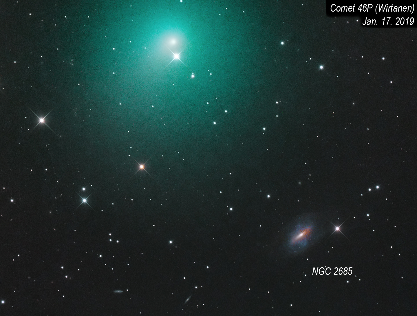 Comet 46P (Wirtanen) Skirts the Helix Galaxy NGC 2685 – Ursa Major