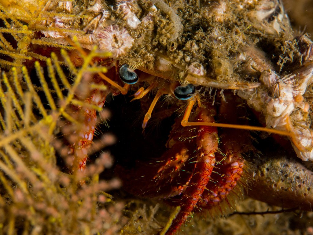 Photographing Hermit Crabs can be a daunting little exercise.  They can disappear into their shells if disturbed, they only rise up off of the seabed about 4 inches, and are often in areas that are inaccessible to a camera and strobes.  While shooting this Bar-Eye, I had to angle my lights as low as possible and basically ‘sit’ my camera on the sea floor in the path of the approaching creature.  There wasn’t room for me to lay my head down to line up the shot exactly, so this image was more-or-less a ‘shot from the hip’.  Once I lifted my gear to review the picture, I was excited to see successful results.