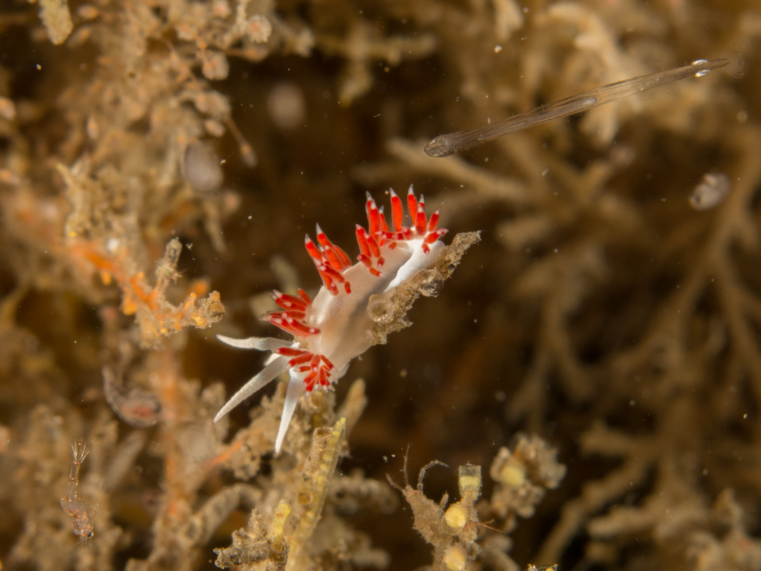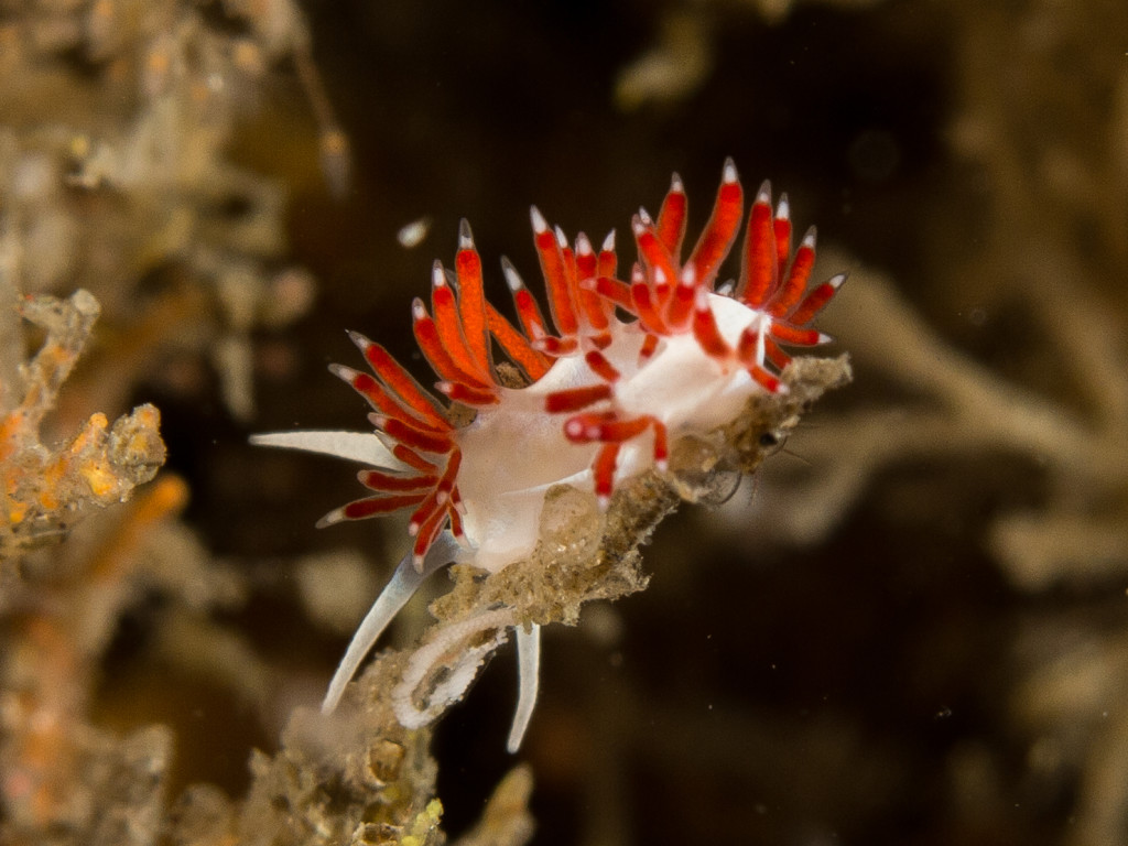 Flabellina’s are some of the smallest, and most beautiful, nudibranch subjects under the bridge.  This was the first one I had ever found, cruising slowly across some Bugula eating its dinner of hydroids.  This animal is so tiny, that I was literally in shock when I had first noticed it – I stared at it for a good two or three minutes before I was sure it was even a nudibranch.  Bright red cerata (spike-shaped respiration appendages) cover the dorsal side of this mainly white nudi, which should make it easier to see, right?  Wrong.  Look at the second image and you can see planktonic animals moving across the frame, mere millimeters in length.  I was working hard to capture this moment before the tide switched and we were promptly asked to leave by the strong tide change.